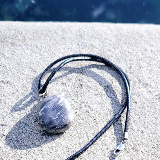 BEAUTIFUL GREY & WHITE QUARTZ CRYSTAL PENDANT.