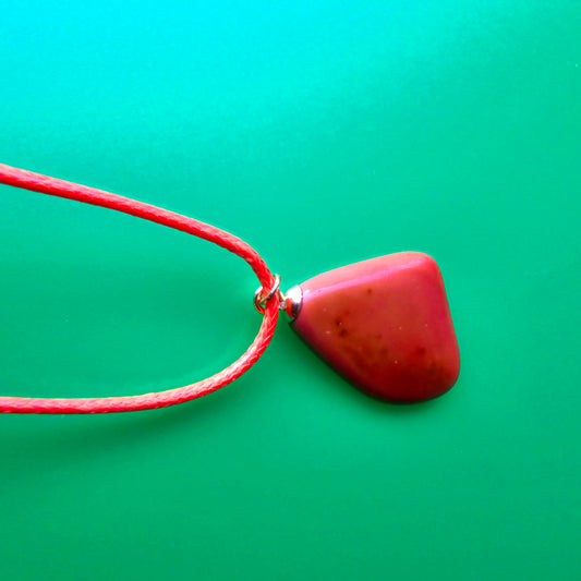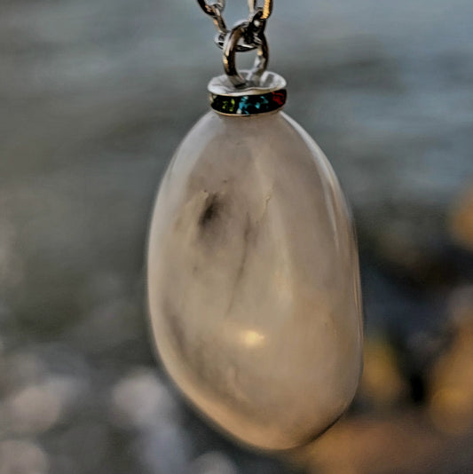 BEAUTIFUL WHITE QUARTZ GEMSTONE PENDANT WITH TRACES OF RED AND BLACK.