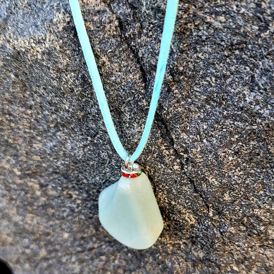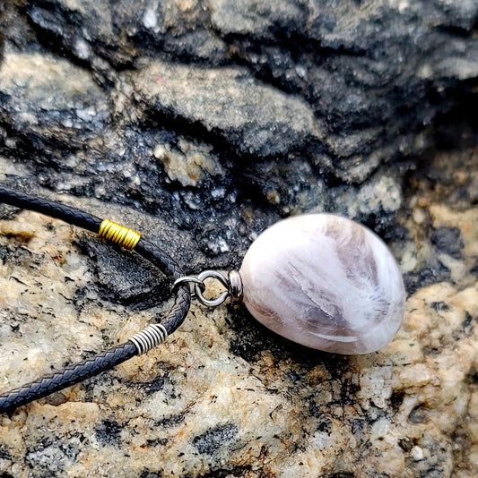 BEAUTIFUL WHITE QUARTZ GEMSTONE PENDANT WITH TRACES OF RED AND BLACK.